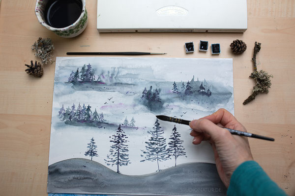 Landschaft mit Wäldern und Bäumen unter Anleitung (Aquarell oder Wasserfarben) |